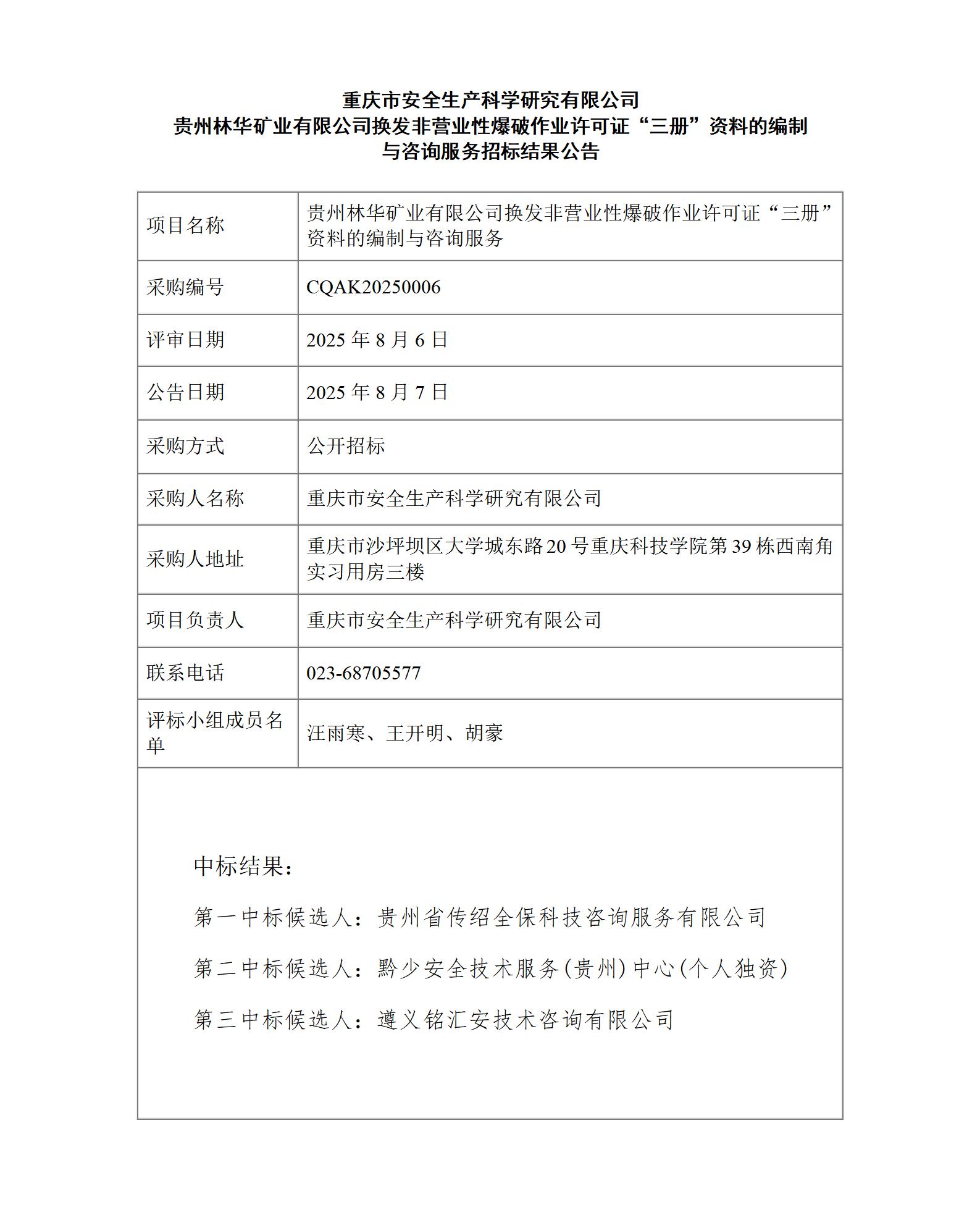 重慶市安全生產(chǎn)科學(xué)研究有限公司 貴州林華礦業(yè)有限公司換發(fā)非營業(yè)性爆破作業(yè)許可證“三冊”資料的編制與咨詢服務(wù)招標結(jié)果公告