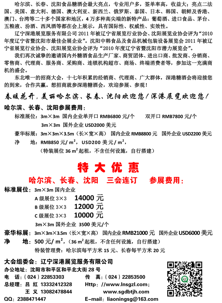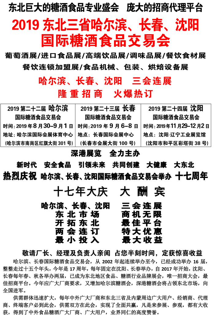 | 2019東北三省哈爾濱、長(zhǎng)春、沈陽(yáng)食品糖酒會(huì)三會(huì)連展 展位有限 特大優(yōu)惠! | |
