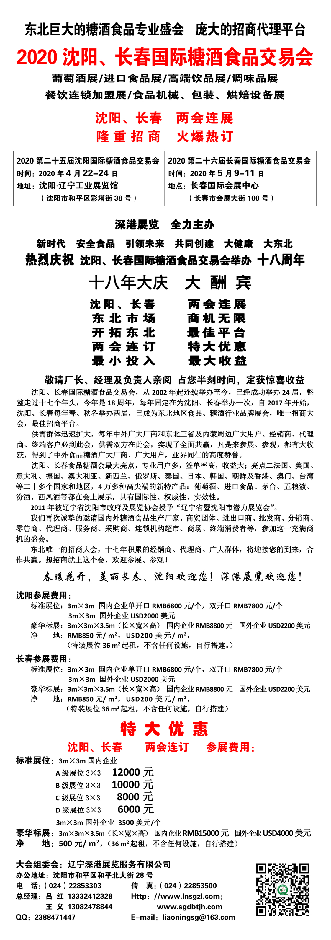 | 2020沈陽、長春食品糖酒會(huì)兩會(huì)連展 展位有限 特大優(yōu)惠! | |