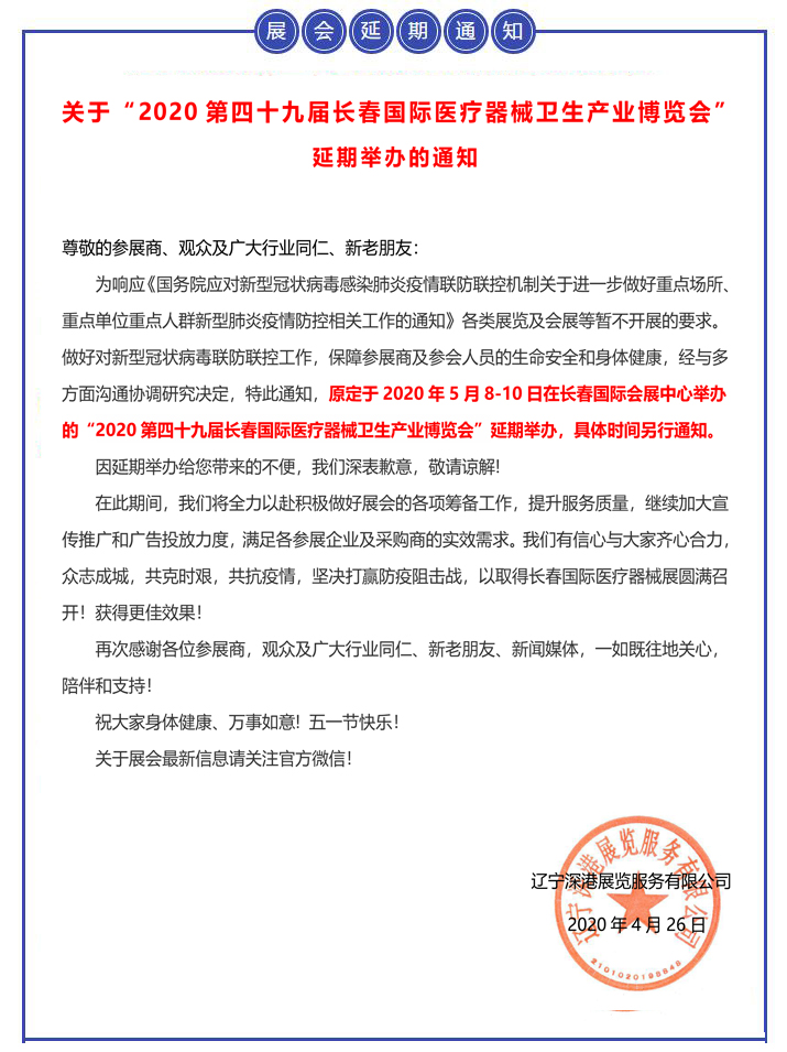 【重要通知】關(guān)于“2020第四十九屆長(zhǎng)春國(guó)際醫(yī)療器械衛(wèi)生產(chǎn)業(yè)博覽會(huì)”延期舉辦的通知