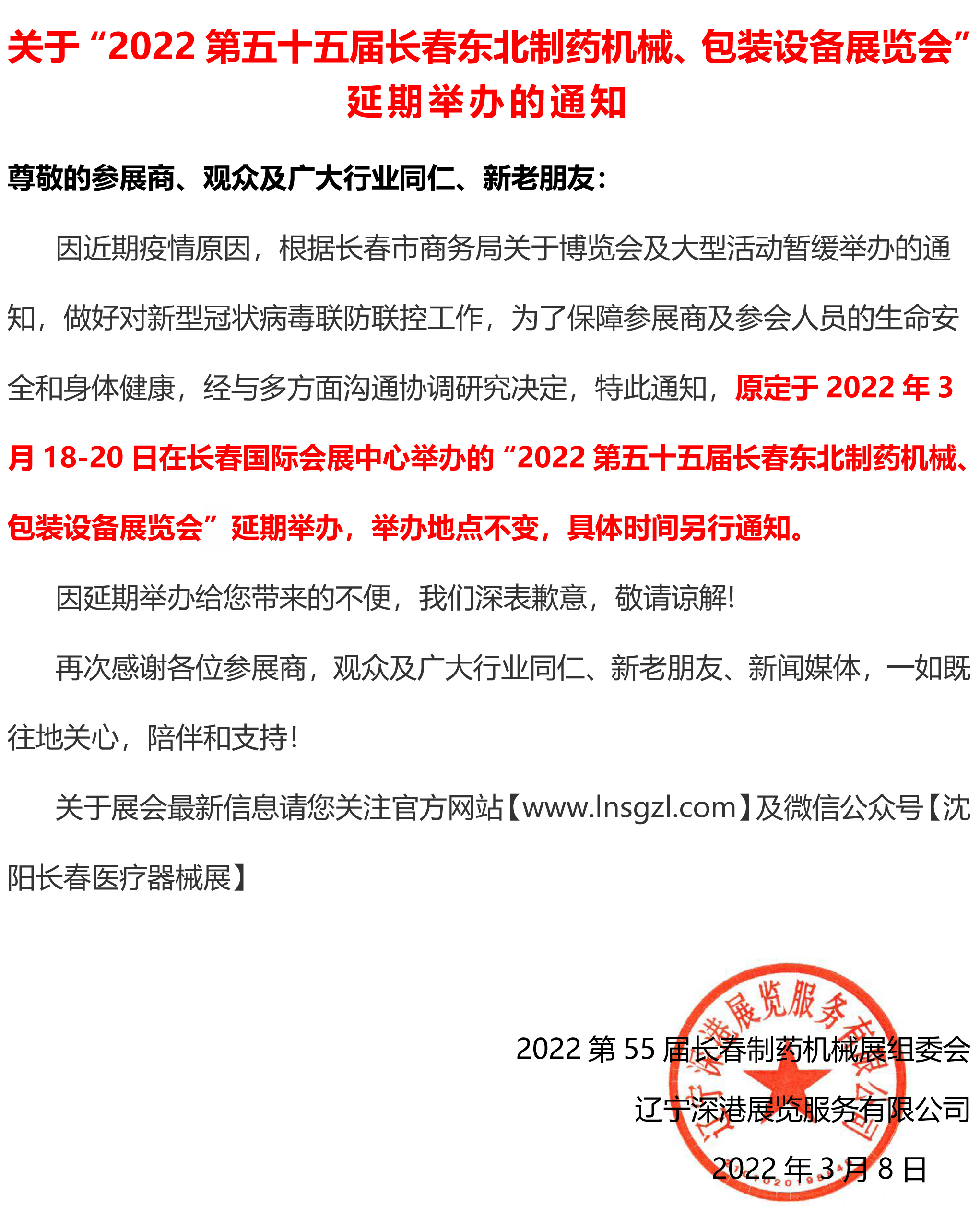 延期通知|2022第五十五屆長春東北制藥機械、包裝設(shè)備展覽會