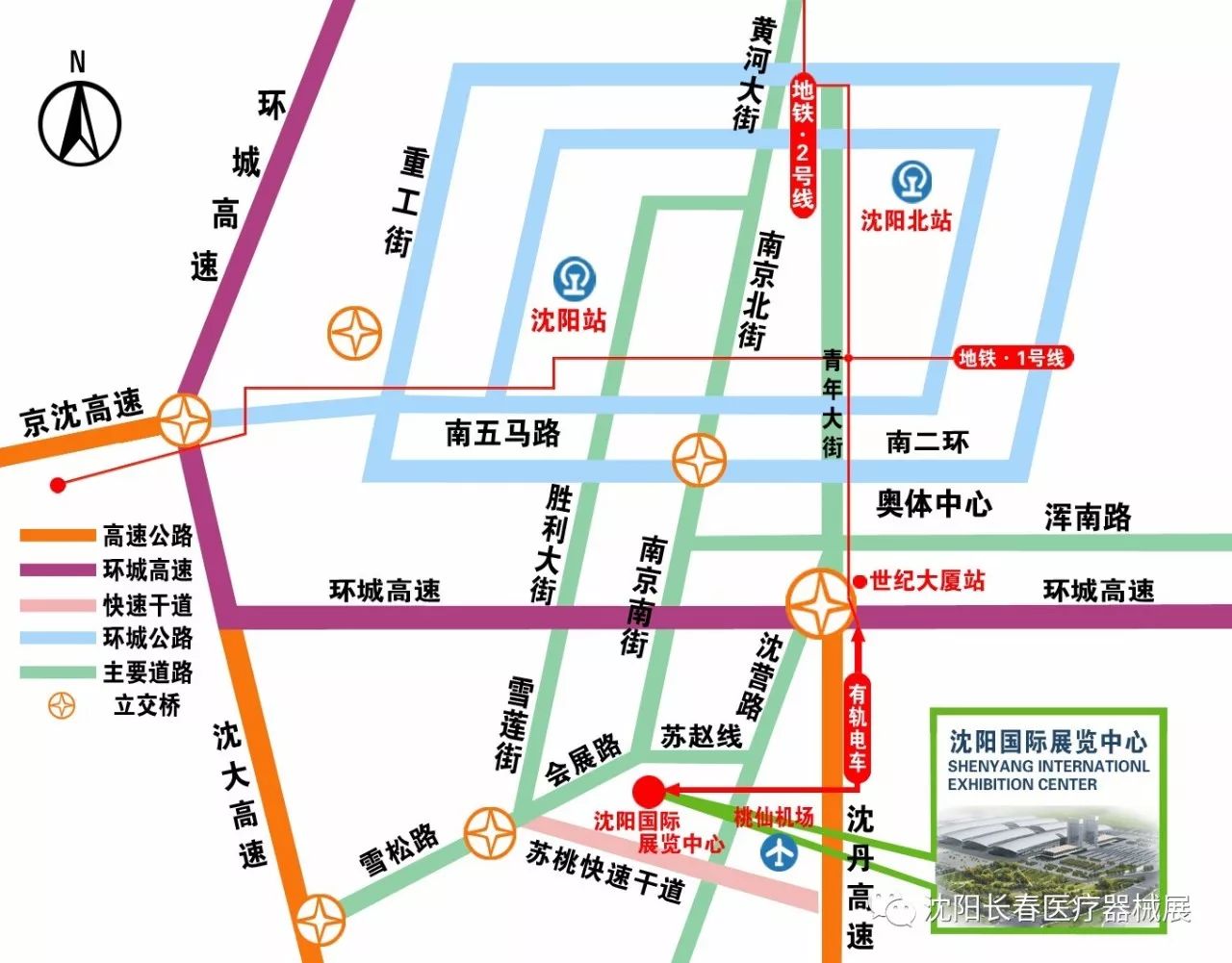 333路:沈陽北站→彩電中心→交通駕校考試場(沈陽國際展覽中心) 327路:沈陽站→十里錦城站下車,沿會展路向東步行300米可以到達沈陽國際展覽中心 335路:21世紀廣場→雪松路口下車,沿會展路向東步行300米可以到達沈陽國際展覽中心 165路:鐵西家樂?!镥\城站下車,沿會展路向東步行300米可以到達沈陽國際展覽中心 165路:鐵西家樂?!镥\城站下車,沿會展路向東步行300米可以到達沈陽國際展覽有軌電車:有軌電車2號線--有軌電車1號線(有軌電車2號線,桃仙機場站上車,新松智慧園站下車,步行200米,轉乘有軌電車1號線,新松智慧園站上車,會展中心站下車,步行410米至沈陽國際展覽中心)